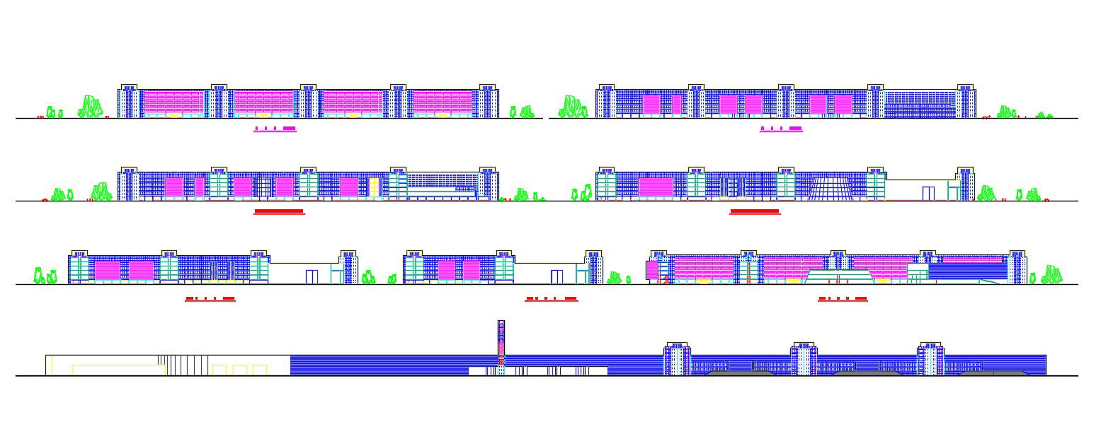 Building Elevation Design AutoCAD File includes the details of the front elevation and back elevation of all the buildings. Also shown some landscape area.