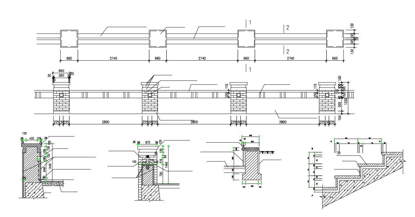 2d CAD drawing details of compound wall plan and elevation design that shows wall dimension details along with staircase structure detailing download CAD file.