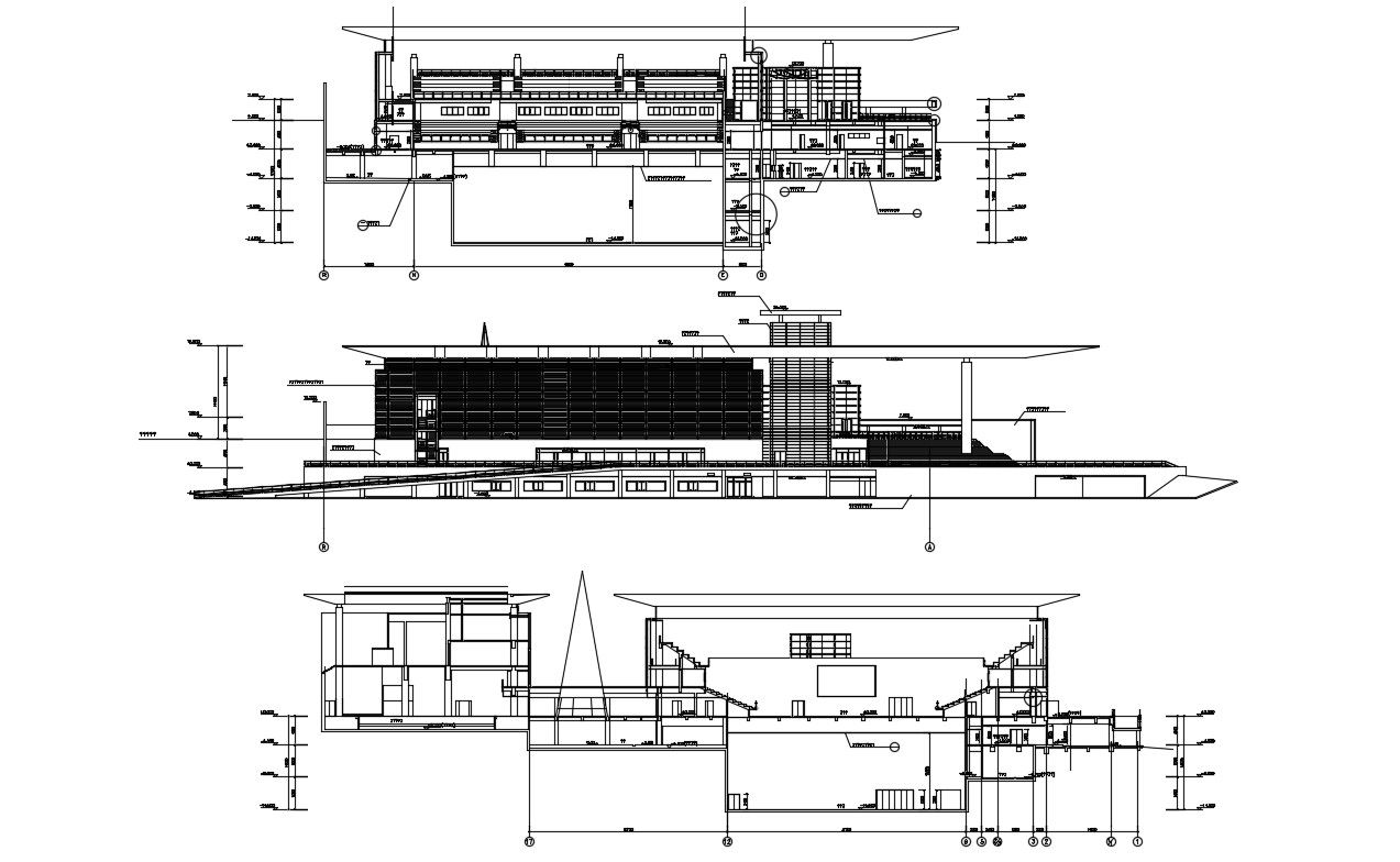 Sports center building front elevation design along with building sectional details, staircase design, building floor height, centerline, and various other units details presented in CAD drawing download file.