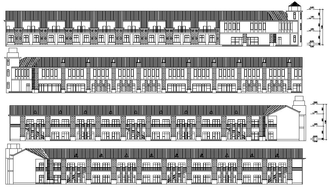 Commercial Building AutoCAD elevation CAD drawing shows the details of the right side elevation, left side elevation, front elevation, and rear elevation. Also given the dimension details.