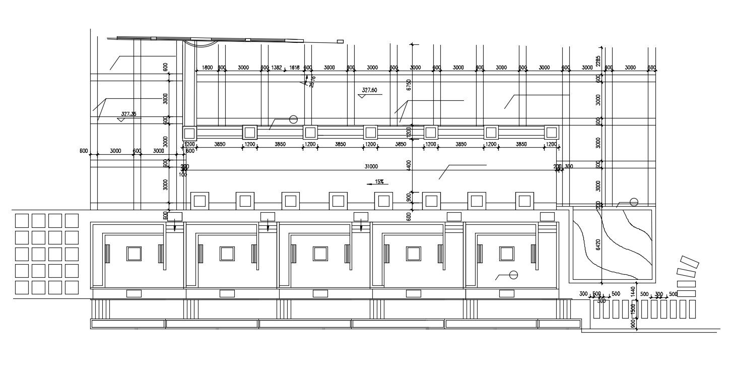2d CAD drawing details of garden area sitting design plan that shows planter pots details along with sitting bench unit, walkway path, dimension set, and various other units details download file for free.