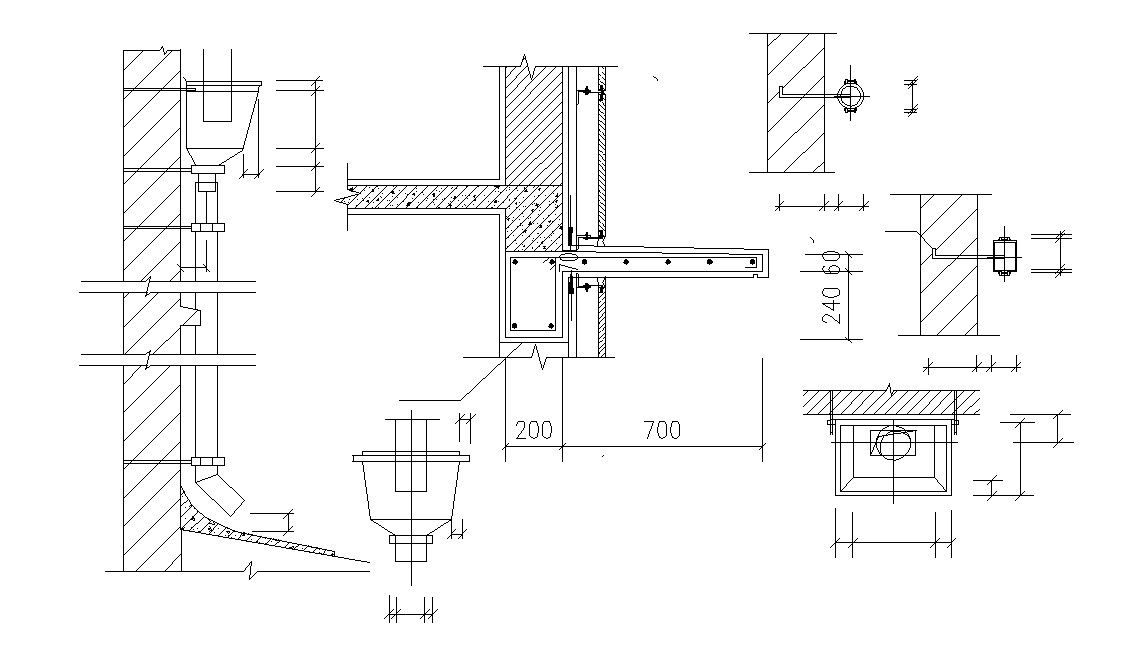 CAD drawing of water outlet pipe design section drawing that shows Plumbing pipe units details along with pipe bracket and various other units details download a CAD file for free.