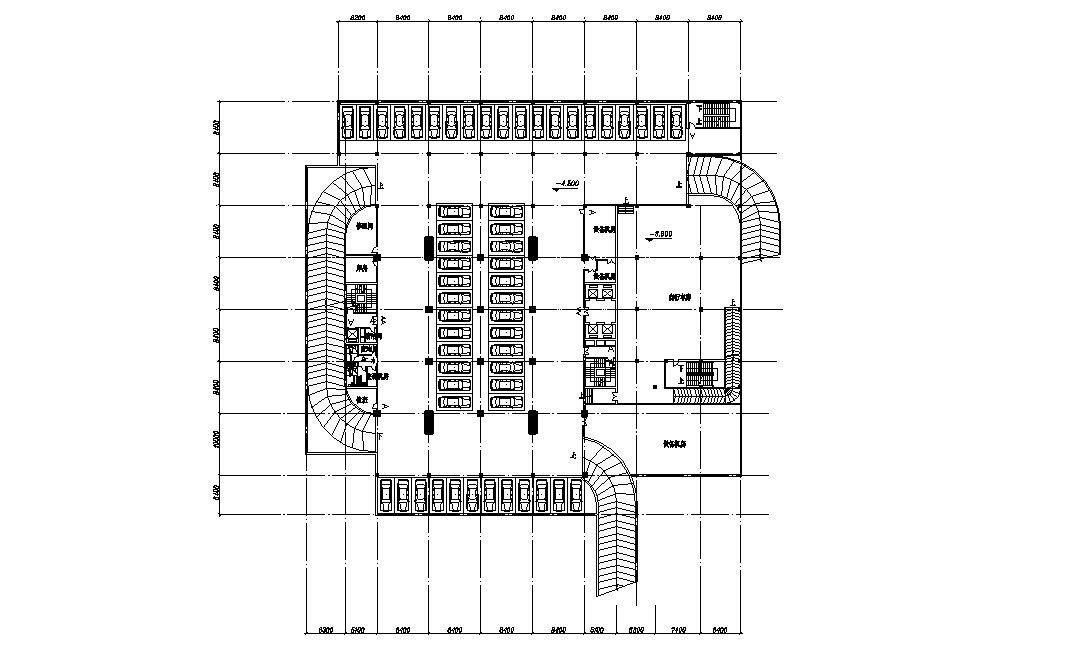 Parking lot design plan that shows car 90-degree parking system design along with parking area markings, ramp design, staircase, lift elevators units, dimension set, and various other blocks details download a CAD file.