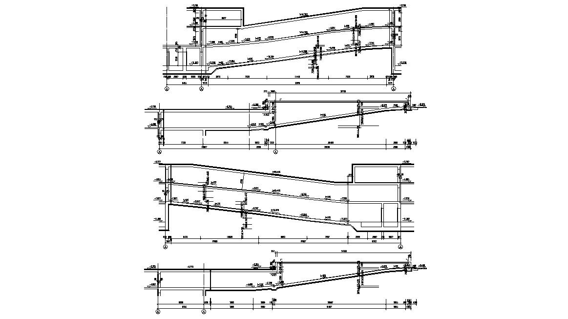 Sectional details of the ramp that shows ramp slope design along with centerline, dimension set, leveling, and various other component details download CAD drawing for detailed work.