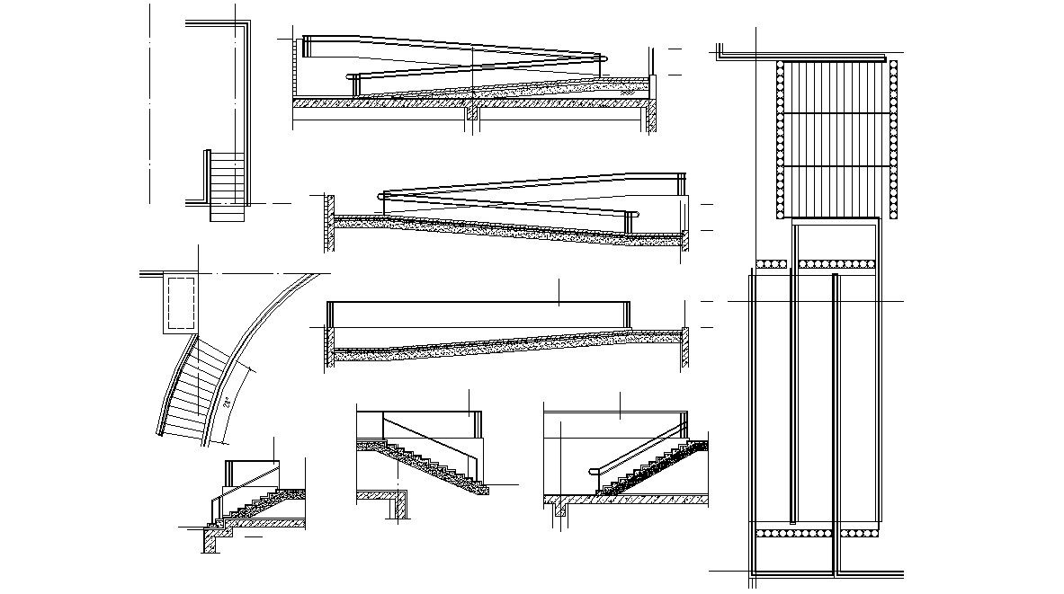 2d CAD drawing details of ramp plan and sectional drawing along with staircase details that show handrail, staircase riser tread, and various other units details download file for free.