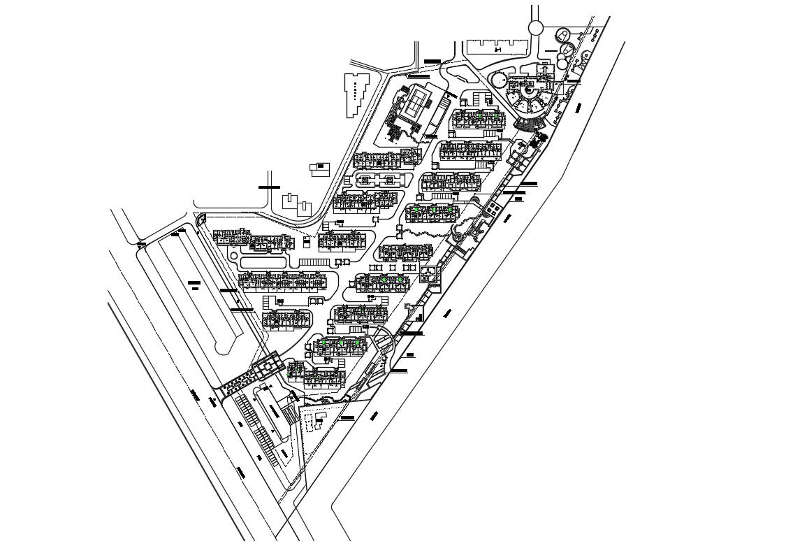CAD drawing details of area layout plan along with existing building units, landscaping, road networks, parking area, building plans, and various other units details download the file.