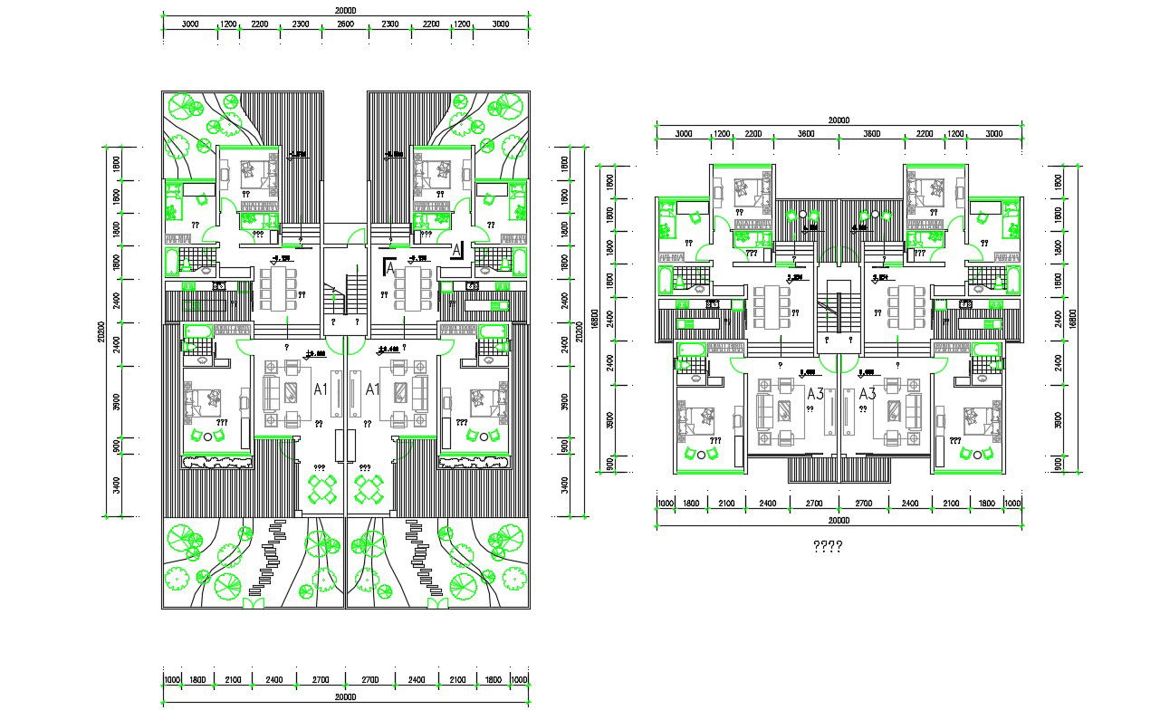 Details of residential bungalow furniture layout arrangement plan that shows bungalow floor level, dimension set, room details in each bungalow, landscaping lawn design, and various other works details download CAD presented file.
