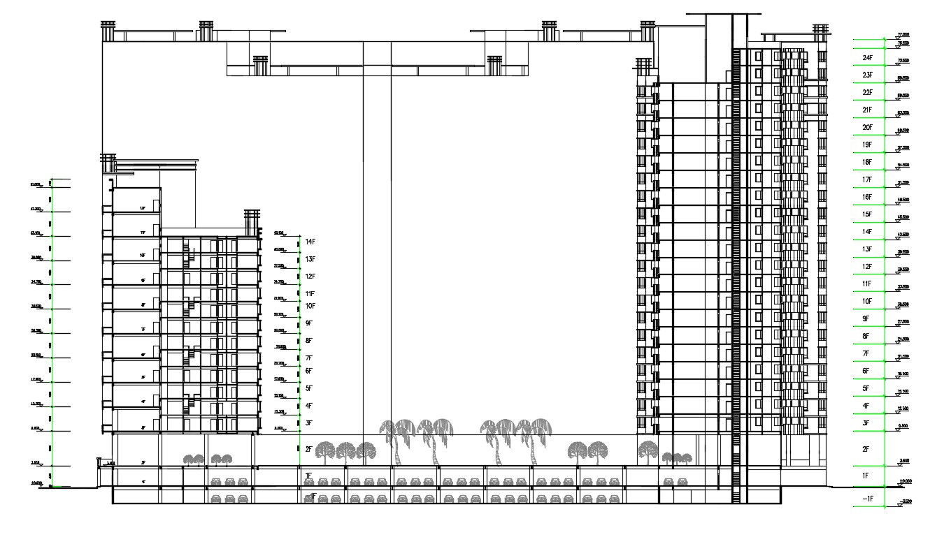 Detail of residential apartment section and elevation drawing along with building floor leveling, floor height basement parking space area, and various other details download CAD presented file.