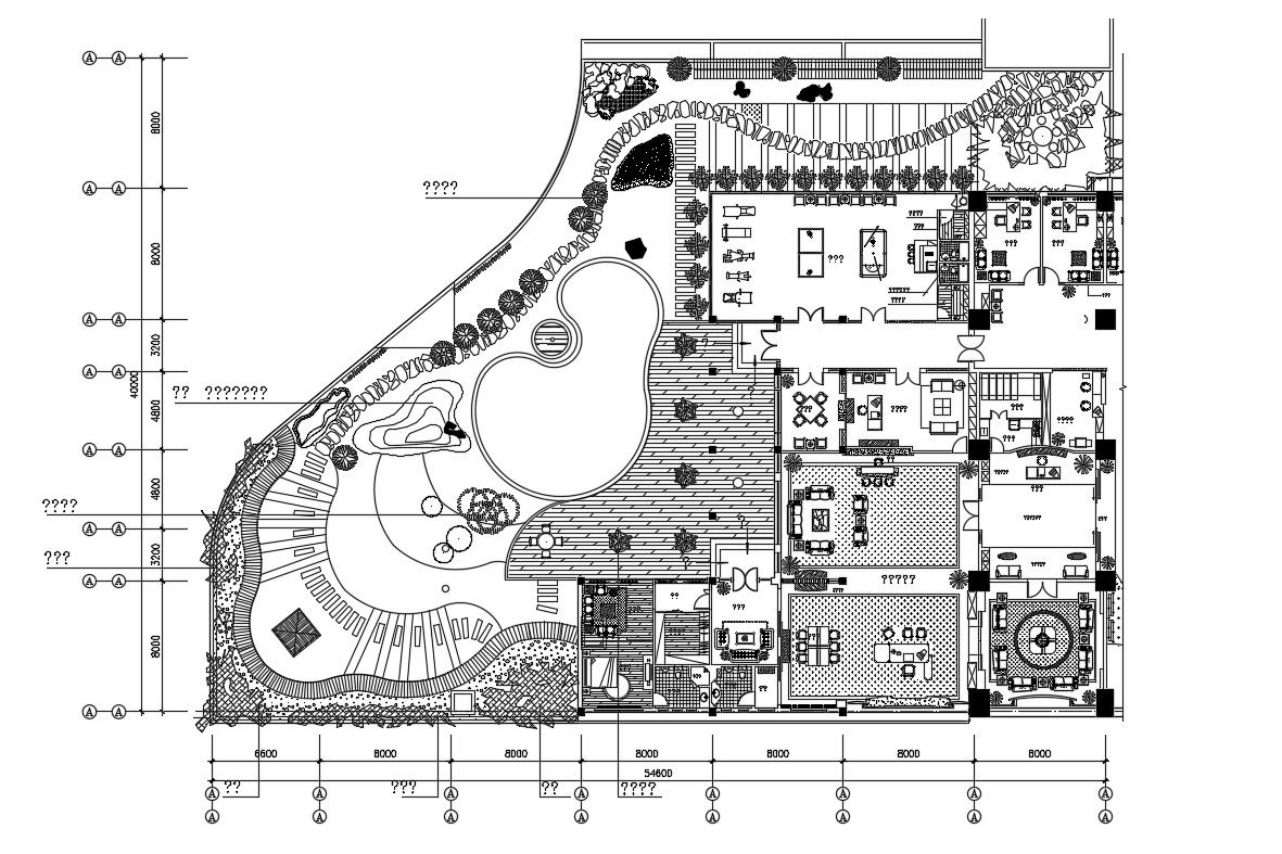 Club House Furniture Layout Plan shows the details of the swimming pool area, landscaping, gym, waiting room, meeting room, bedroom, living hall, toilet, and various details. Also given the dimension details.