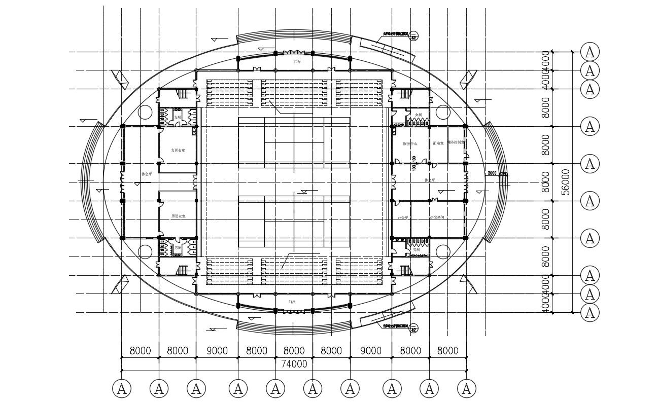 Badminton Court AutoCAD Plan includes the details of the female dressing room, male toilet, lounge, female toilet, locker room, office, service center, switch room, fire control room, heat exchange room, barrier-free ramp, hall, and many more details. Also given the center line plan along with the dimension details.