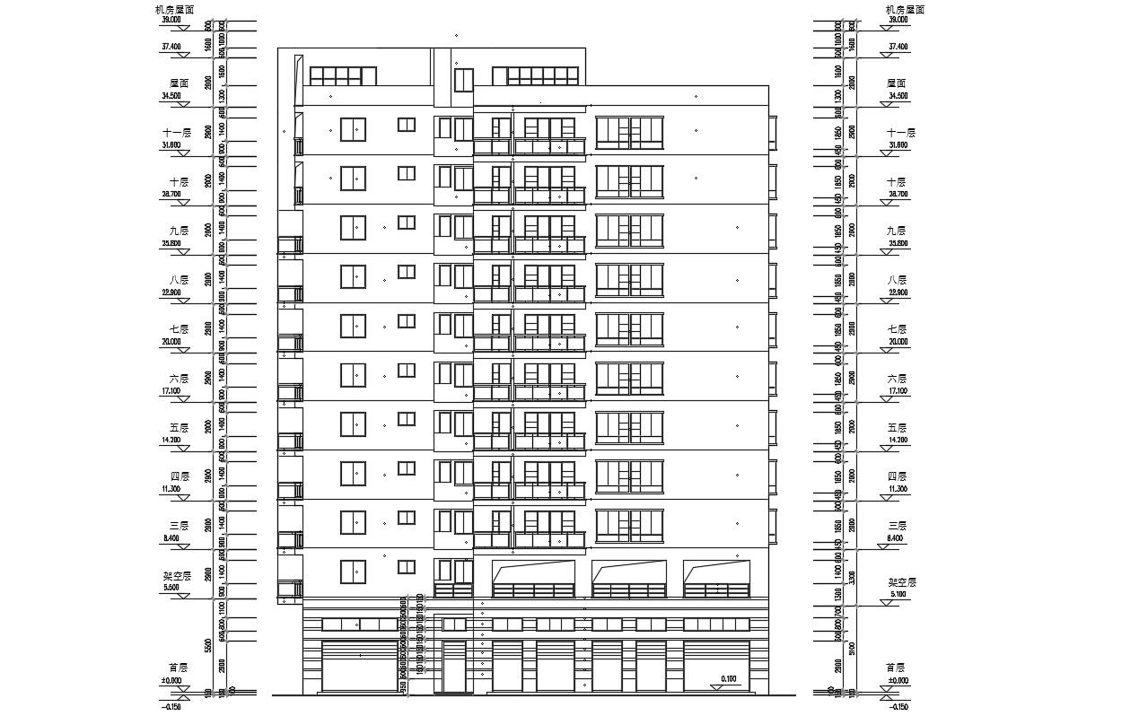 Front elevation design of Residential multi-story apartment that shows building floor leveling, building each floor height and various other units details download CAD file for free.