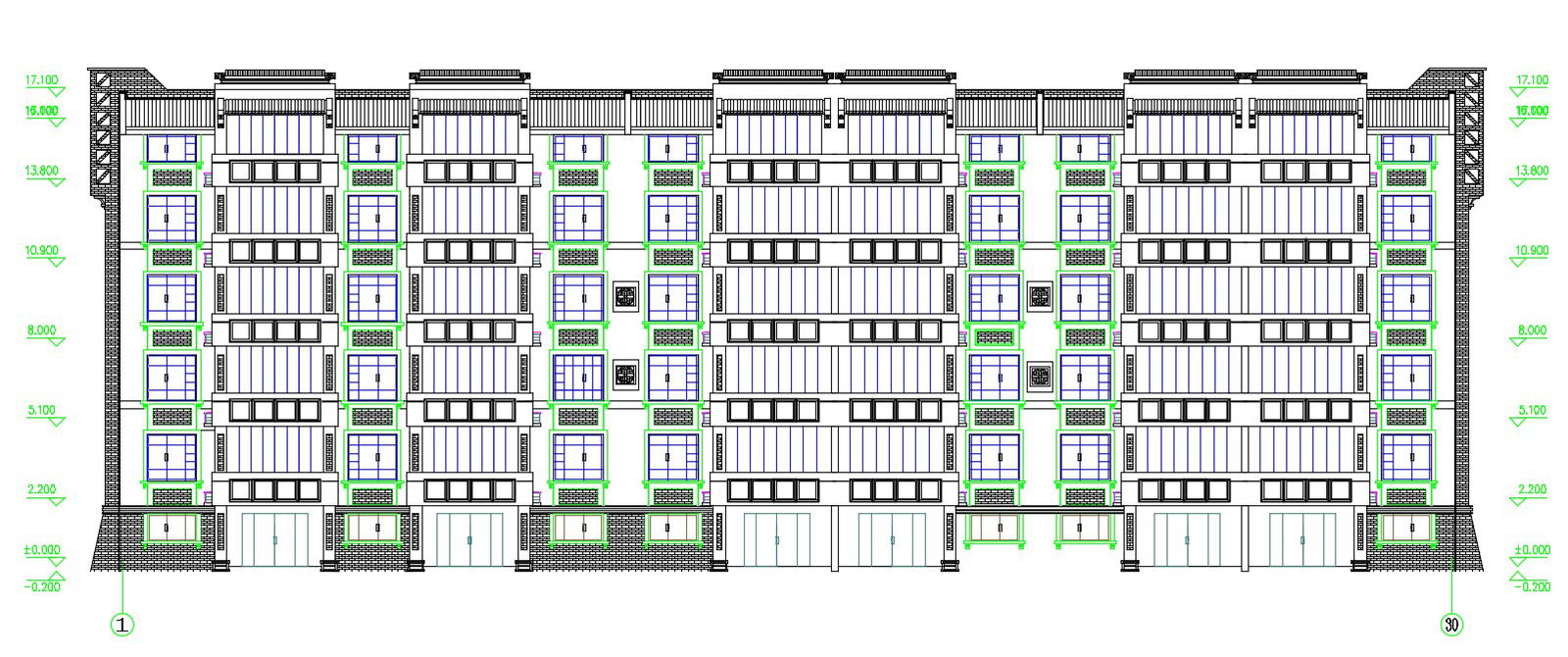 Download The Elevation Apartments AutoCAD File; this is the elevation of the apartment includes floor levels, basic hatching,door-window design, railing design in top-level, cantilever balconies, glass door on ground floor, roof design, in CAD file format.