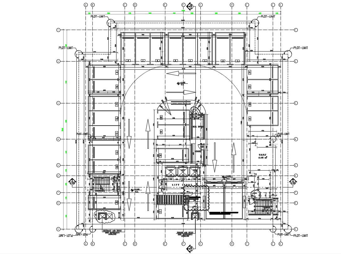 Dormitory design layout plan that shows entry-exit way gate details along with dimension working set, building section line, centerline, staircase, and building various other amenities details download CAD Drawing for the detailed presented plan.