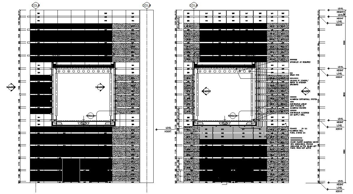 Glass Building Elevation CAD Drawing includes the details of the elevation building along with the glass windows and doors. It also shows the wall along with the entrance of the footbridge. Dimension details are also given.