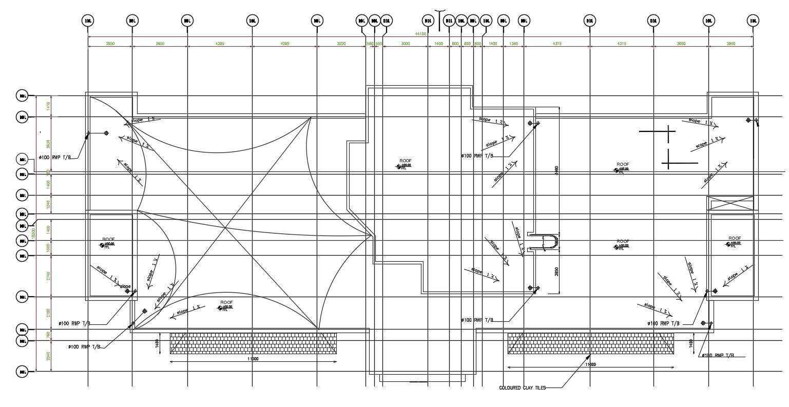 Commerce Building Design Terrace layout plan that shows center line details, dimension set, tensile shade and various other units details download CAD file for free.