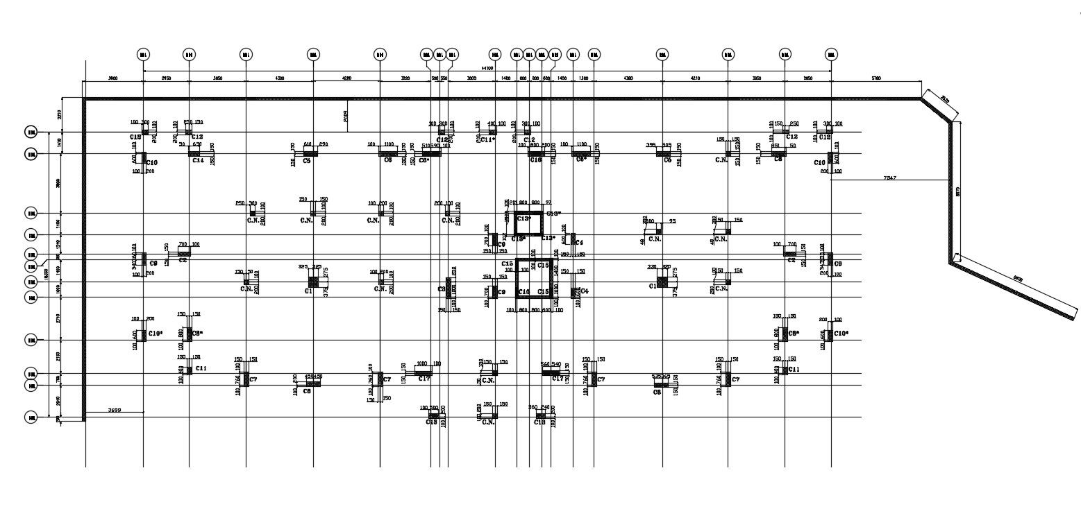 Column arrangement layout plan for building construction that shows column spacing details along with centerline, dimension set, and various other structural blocks details download a CAD file.
