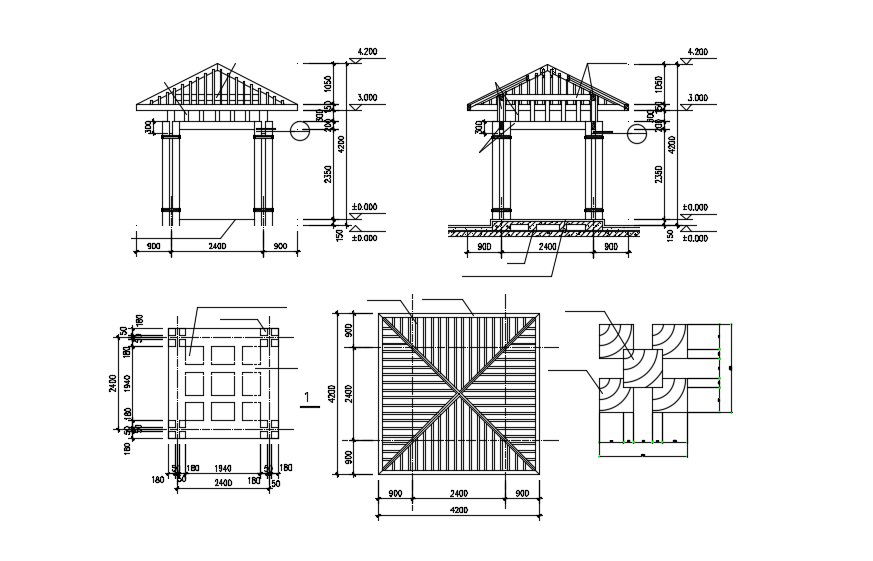 Gazebo shade design plan and an elevation drawing that shows roof truss details along with the gazebo section, dimension set details download CAD file for free.