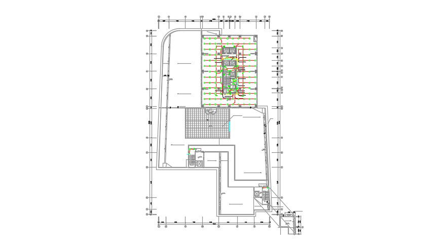 2d CAD drawing details of building design plan along with the center line, dimension working set, staircase, elevator units, and various other building amenities details download file for free.