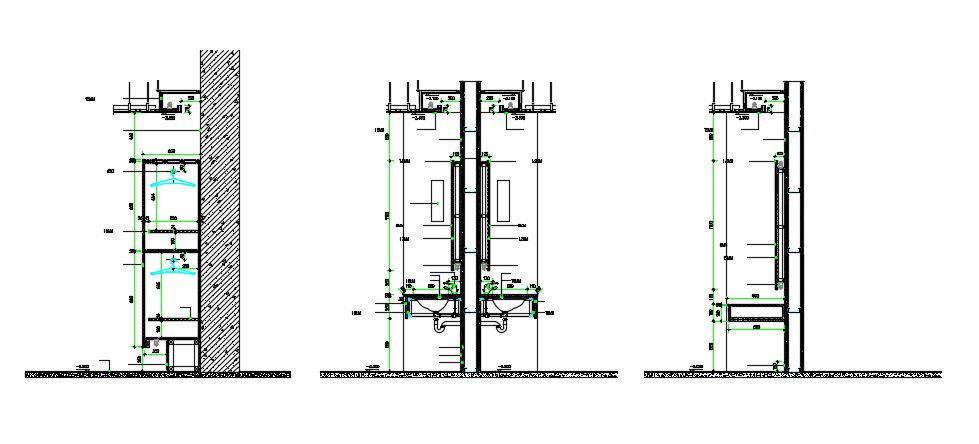 CAD drawing details of sanitary washbasin units section design that shows dimension set, plumbing pipe, faucets, ceramic tiles, and various other components details download file for free.