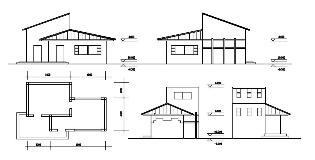 Download Construction Site Office Design AutoCAD File; this is the site office design with the plan and three side elevation its a simple plan with the main foyer, waiting area, office for the owner and toilet, with dimension, also in elevation, its a sloping roof style, one and a two-story building, the elevation is traditional style.it's a CAD format.