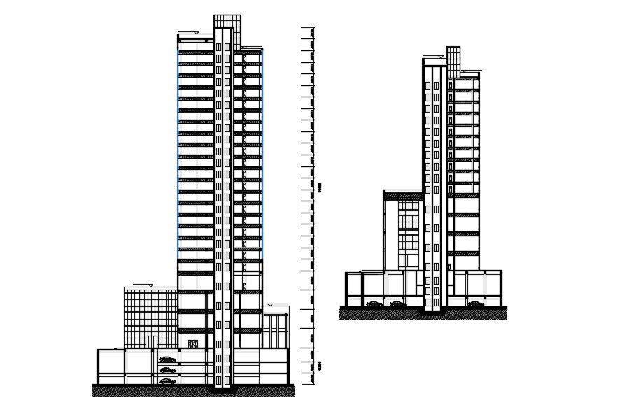 Free Download Modern Commercial Building Section DWG File; this is the high rise commercial building section with basement parking detail its a 24 storey building section, backside glass elevation, floor level dimension, Its an AutoCAD file format.