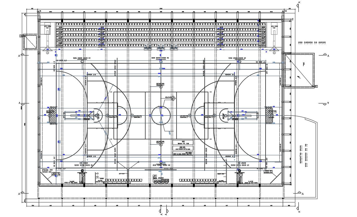 Layout Plan design of Basketball ground that shows ground marking and signs, audience seating arrangement, dimension set, section line, basketball net, and various other amenities details download AutoCAD file.
