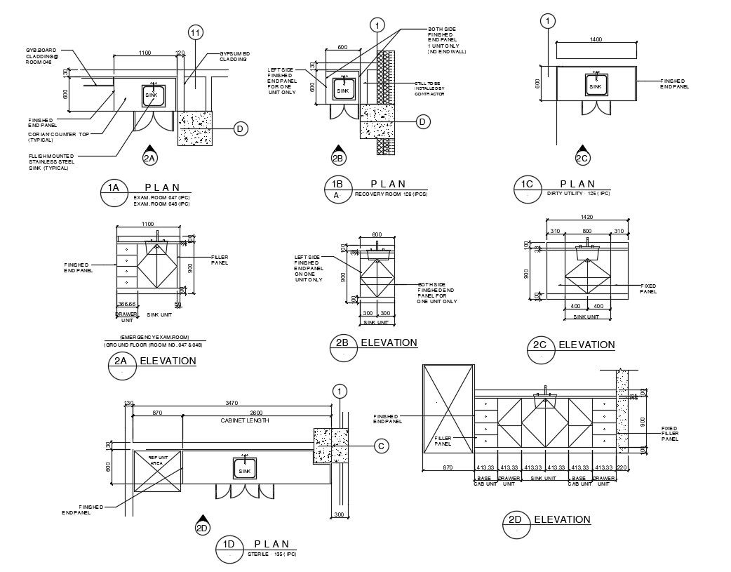 2D CAD Drawing Sink Section Design DWG File; this is a construction detail of the sink includes plan, a different side of the elevation, drawer detail, texting detail, panel detail, showing section line in the plan, it's a wooden drawer and cabinets, its an AutoCAD file.