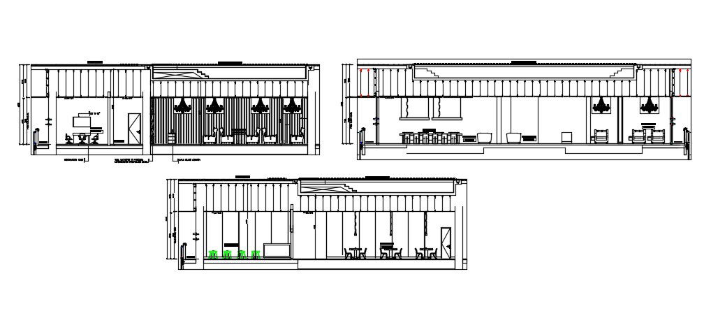 2d CAD drawing details of clubhouse section design that shows different sectional details of single storey clubhouse building along with furniture units details download AutoCAD file for free.