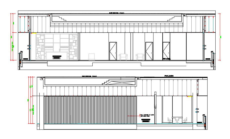 Clubhouse section design that shows furniture blocks details in the clubhouse along with building floor level details download CAD file for free.