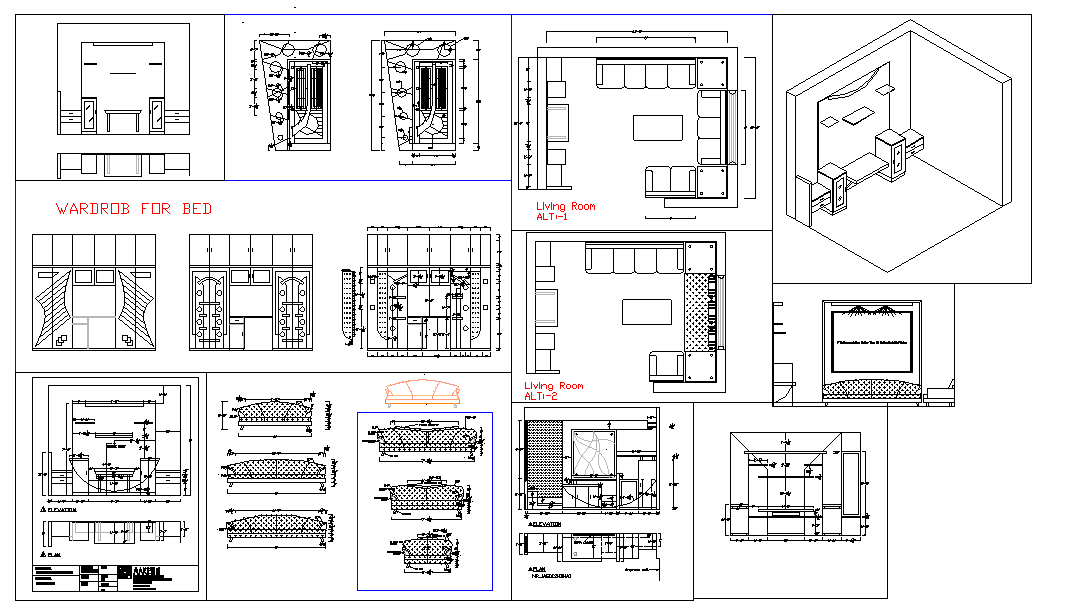 Sofa set, T.V unit & bed all Elevation design include dimension design. Sofa all side section detail.
