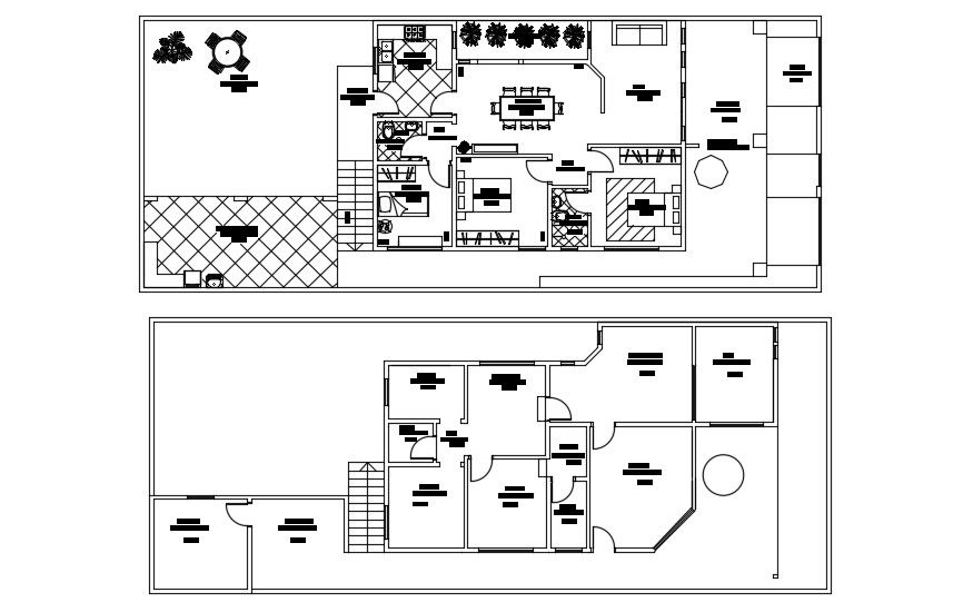 2D CAD Drawing Simple Bungalow House Design AutoCAD File; this is the bungalow plan of two floor includes garden area, outer side kitchen for party zone, drawing room, dining room, kitchen, common toilet, three-bedrooms, inside the planter area, this is on the ground floor, four-bedrooms, terrace , attached toilets, lounge, storeroom, all this on the first floor,its a DWG file format.