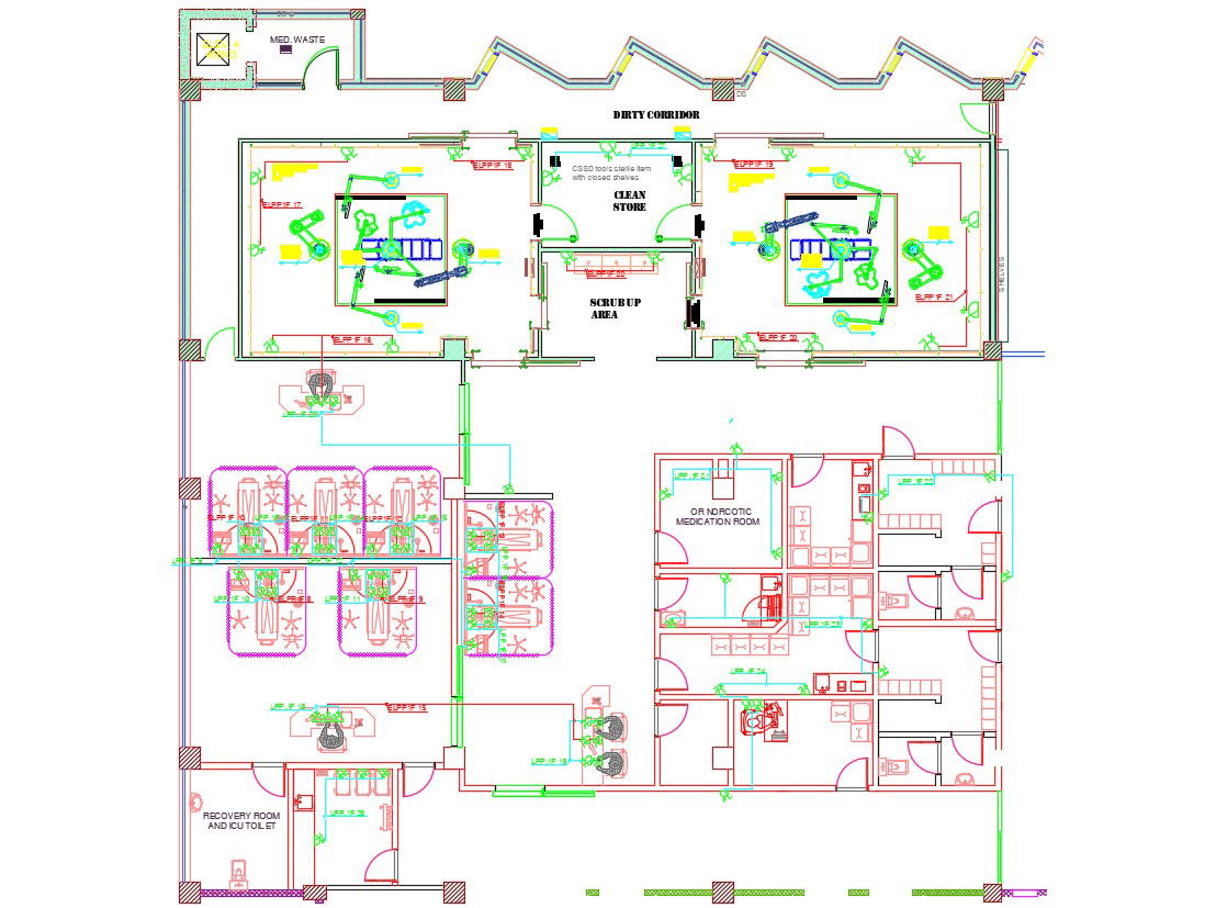 CAD drawing details of hospital building design plan that shows hospital room details of the general and private ward, doctors cabin, pantry area, ICU room, operation theater room, and building various other amenities details download AutoCAD file for detailed furniture layout plan.