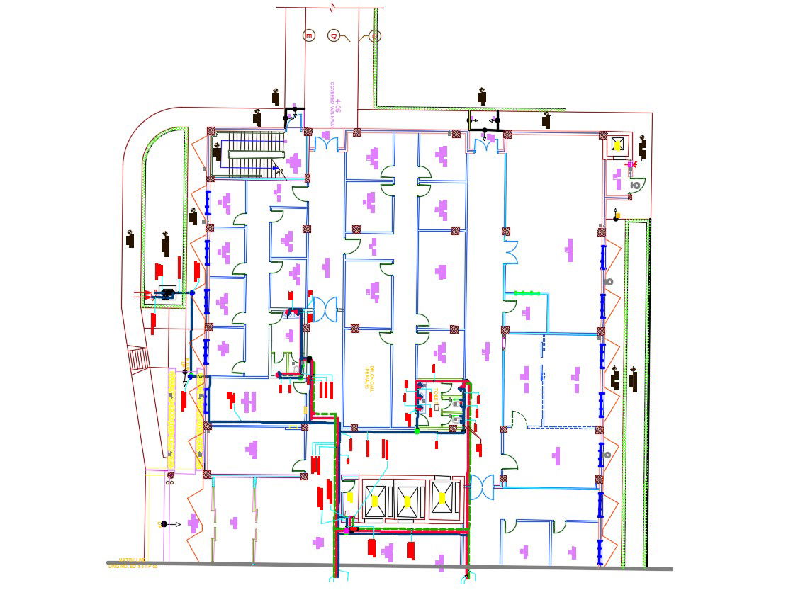 Hospital Building Layout plan that shows building facilities details of laboratory, pharmacy store, doctor cabin, private and general ward, washroom, office room, elevators units, staircase, elevators, security room, and various other amenities details download CDA file for a detailed plan.