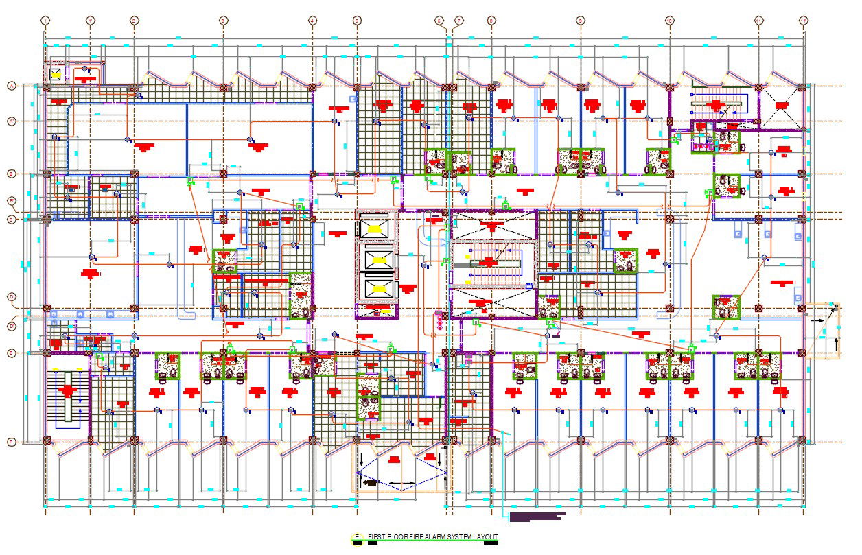 Fire alarm system design layout plan of a hospital building that shows building amenities details of the ICU room, waiting room, locker room, nurse station, doctor cabin, patient wards, laboratory, security room, corridor, fire exit staircase, elevator, and various other units details download CAD file for free.