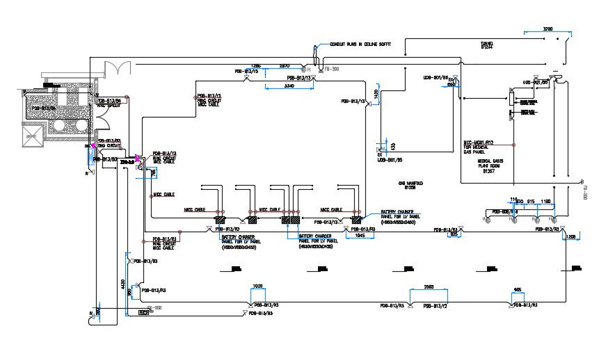 .2d CAD drawing details of electrical wiring system design that shows battery charger panel, mic cable, sump pit, circuit electrical wire, circuit cable, and various other electrical components details download the AutoCAD file.