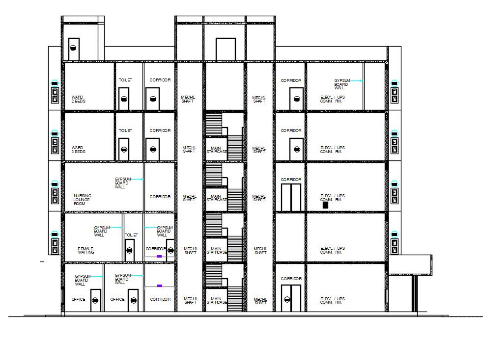 Hospital Building Section CAD Drawing; download free AutoCAD file of hospital building section drawing shows wall detail, staircase, and necessary description.