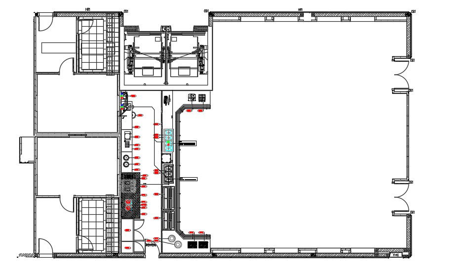 CAD drawing details of a commercial building design plan that shows work station details along with machinery units, room details download file for free.