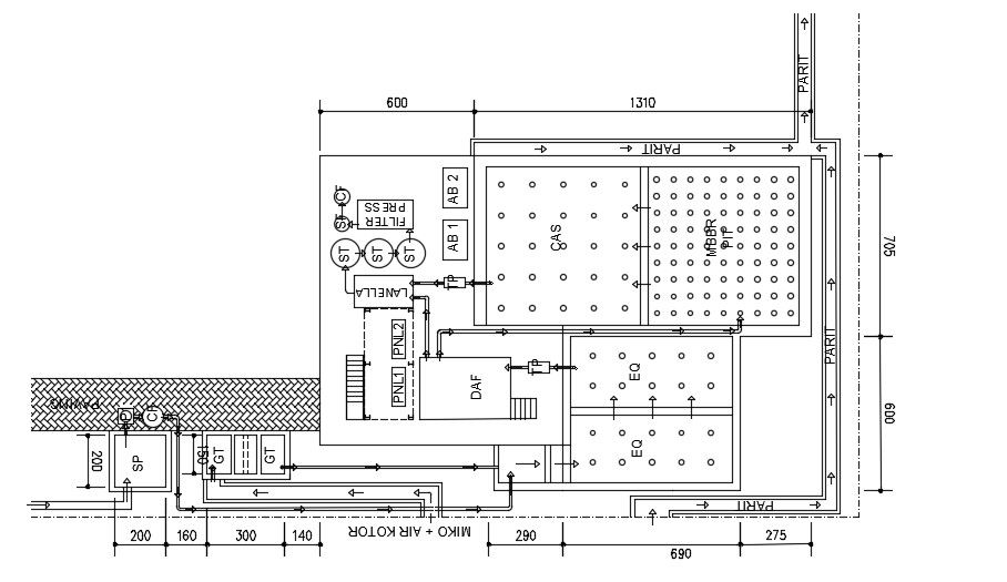 2d CAD drawing details of pond water treatment Moving bed biofilm reactor (MBBR) process design plan that shows MBBR aeration activated sludge tank details along with the pipe, dimensions set, and various other plumbing blocks details download AutoCAD file.