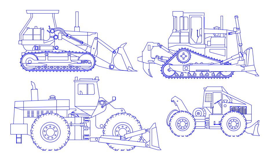 2d CAD drawing details of civil construction vehicle blocks of bulldozer and tractor machine, crawler and wheel-mounted units side elevation design download file for free.