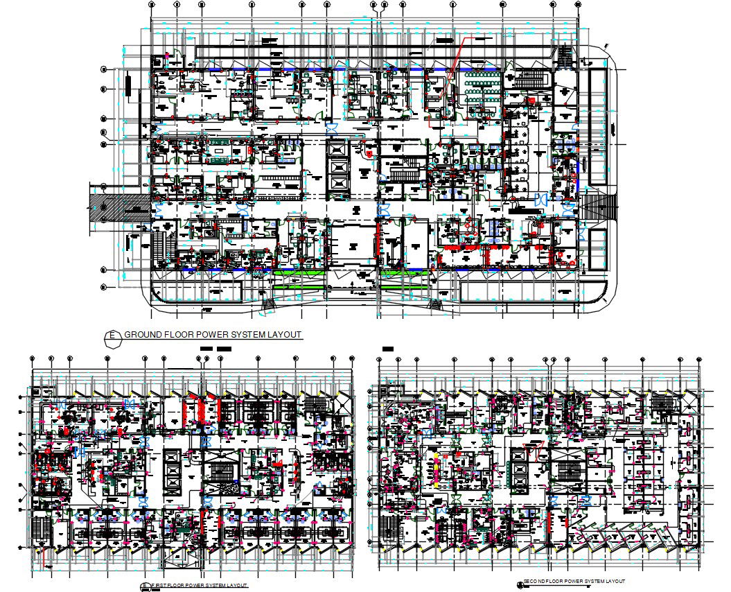 Hospital Floor Power System Layout Plan AutoCAD File; download hospital all floor power system layout plan CAD drawing shows energy storage technologies for generator and the application potential in power system operation along with wiring and lighting point layout plan.