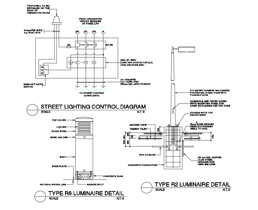 Luminary Street Lighting CAD Drawing; Download free AutoCAD file of luminaire street lighting control diagram and elevation design with description detail.