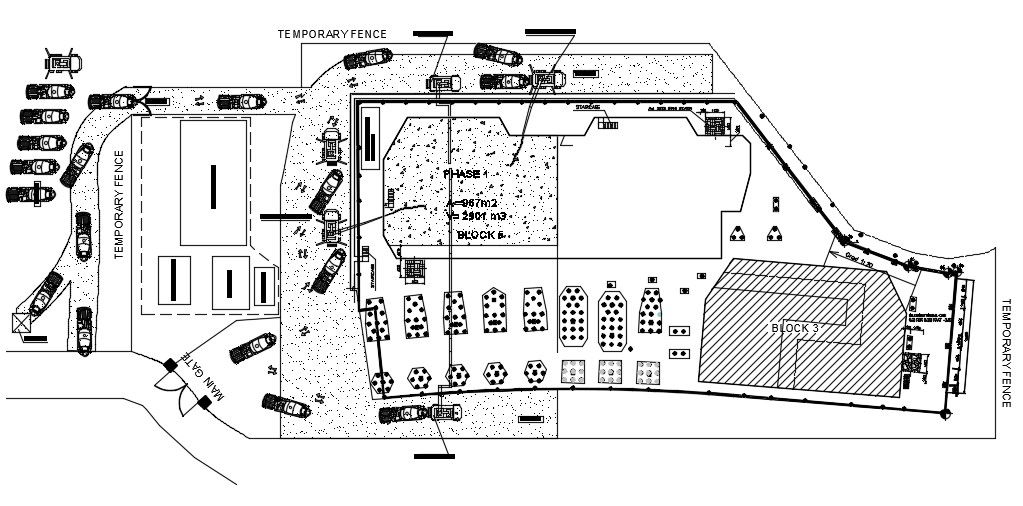 CAD drawing details of commercial building area landscape plan that shows existing building, parking space area, temporary fence, landscape design, and various other details download file for free.