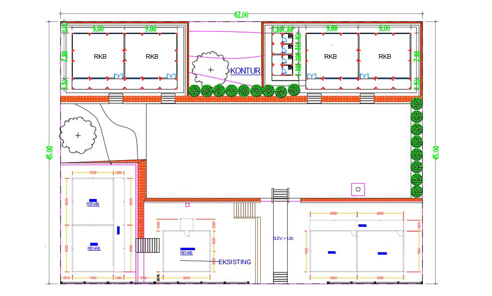 School Building layout Architecture plan that shows building room details along with ground, landscape design, staircase, building length width, and building various other utility details download CAD file for free.