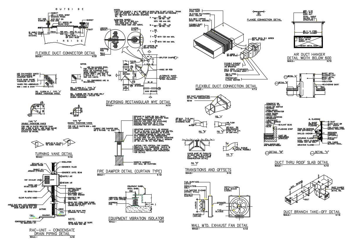 Flexible DUCT Connection AutoCAD File; download DWG File of Duct Branch connection CAD drawing shows opening in floor or wall shall be 3 mm per foot greater than damper dimensions (4.5 mm. greater per foot for stainless) minimum clearance of 6 mm and required for any installation. curtain type vertical fire damper, complete with fasteners, sleeve and perimeter angles, refer to manufacturer's installation instruction for details