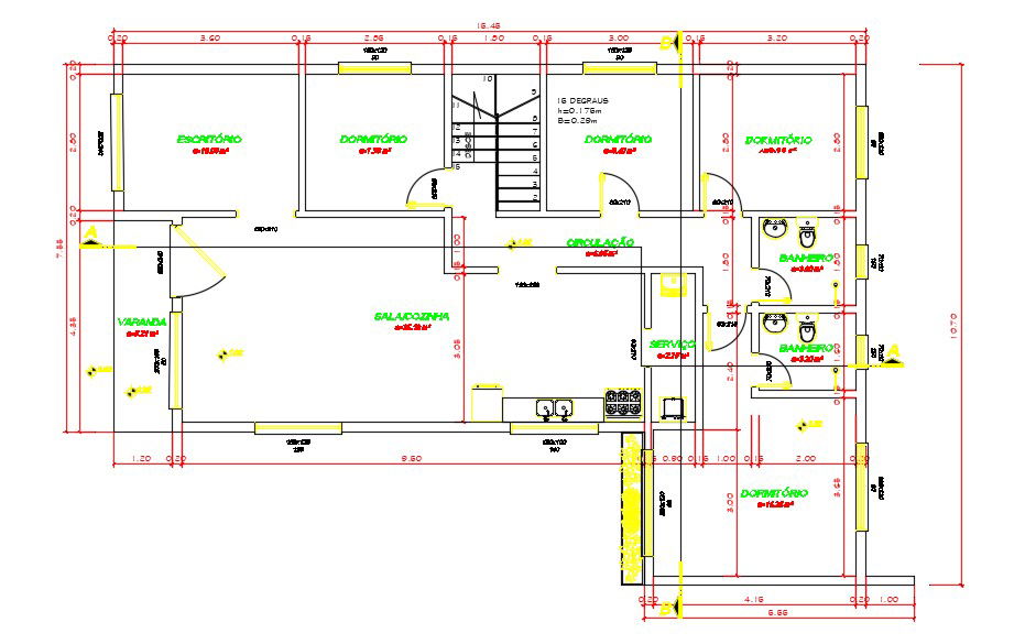 Bungalow House Design With Basic Working AutoCAD File; this is the planning of bungalow includes main entry porch, drawing room, living room, kitchen, dining area, bedrooms with attached toilets, connected passage, stair, door windows, and dimension, this is the DWG file format.