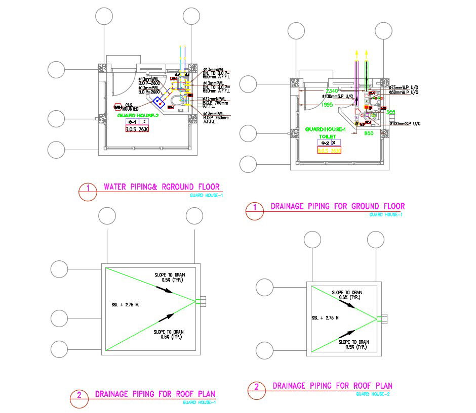 Water Piping Plan DWG File includes the details of the drainage pipe for ground floor plan, drainage piping for roof plan along with the slope of the drain. Also seen the dimension details.