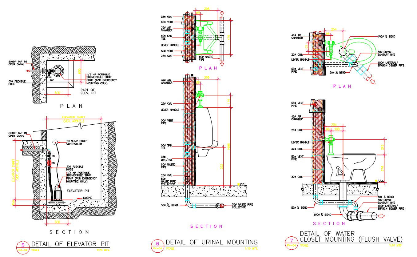 Sanitary Drainage CAD Drawings; Download AutoCAD file of toilet sanitary drainage section drawing shows urinal mounting and water closet mounting plan section details.