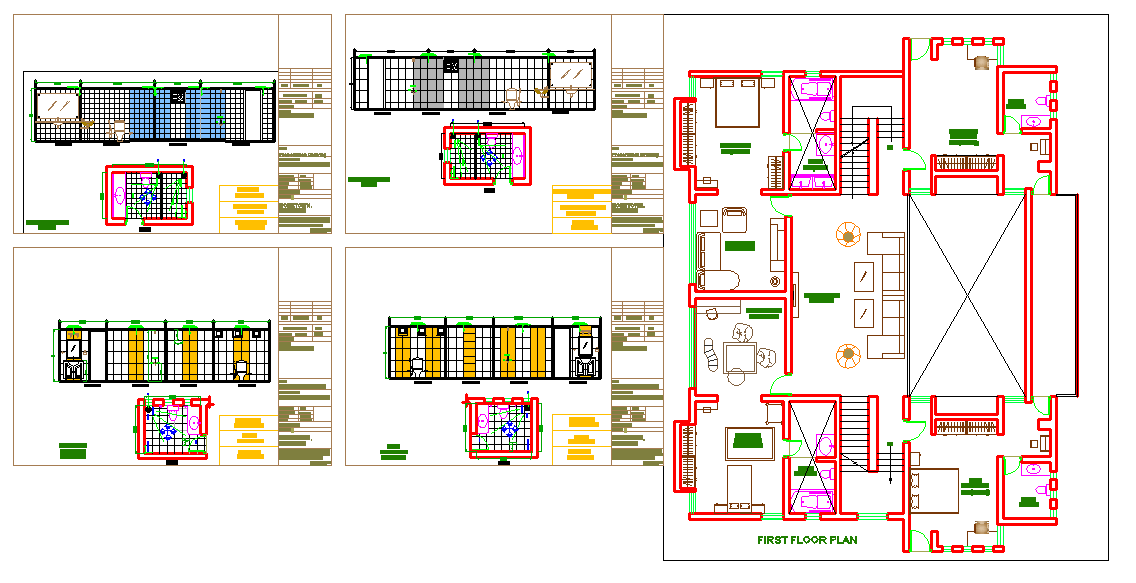 First Floor House lay-out detail & All furniture detail. bathroom design elevation design .