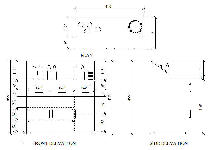 This Standing table drawer & Front elevation, Side elevation, & plan Lay-out detail.