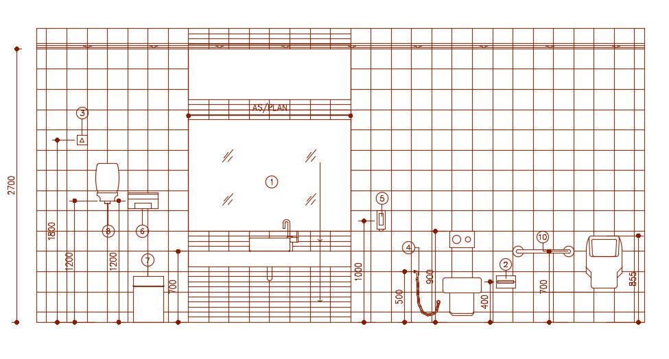 Front elevation design of a bathroom that shows washbasin details along with wall tiles details, water closet, dimension set, dressing mirror, and various other units details download CAD file for free.